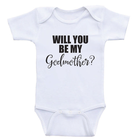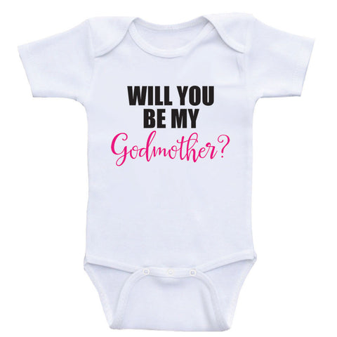 Godparent Baby Bodysuits. Will You Be My Godmother. Hand pressed with high quality bodysuits made for babies. 100% cotton. We are proud to offer high quality soft baby clothes with designs pressed with top onepiece brands that are all used in accordance with the brands policies. We offer white short sleeve baby clothes that fit ages newborn, 3-months, 6-months, 9-months, 12-months, 18-months and 24-months. It's recommended to wash the bodysuit shirt inside out in cold water for the first time. Our baby bodysuits make great gift ideas for Valentine’s Day, Mother's Day, Father's Day, Christmas, St. Patrick's Day, Baby Showers, First Birthdays, Sibling Birthdays, Birthdays, Pregnancy Announcements, Gender Announcements, Brother, Sister, Mom, Dad, Birthdays, Aunt, Uncle, Tia, Tio, Titi, Grandparents, Marriage Proposals, Great Aunt and Uncle, Grandma, Grandpa, Great Grandparents, Cousins, Godparents, Pop Pop, Nana or just putting a smile on someone’s face with something Funny